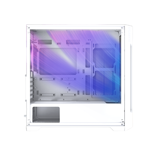 The white finish of the GIGABYTE C102 GLASS ICE MIA gives it a sleek and modern identity. The tempered glass side panel transforms your PC into a display piece, highlighting RGB lighting, cooling setups, and internal hardware.